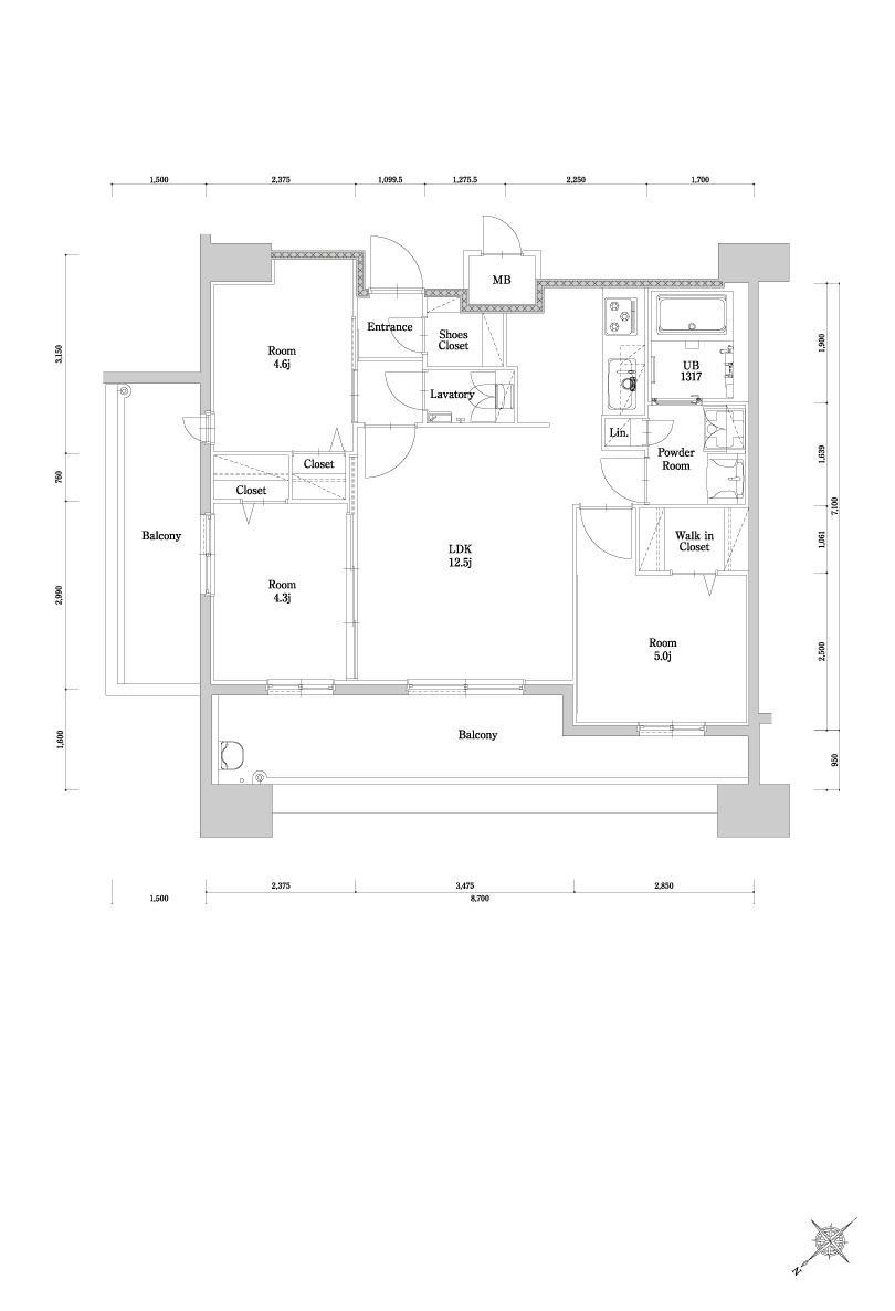 建物すべての面積は各タイプの専用面積の壁芯にて算出しておりますので、内法計算による登記簿記載面積は多少減少します。