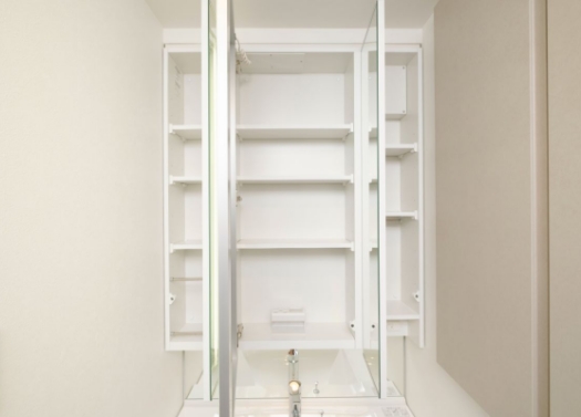 鏡の裏には、大容量の収納を備えています。化粧品類や薬類などを収納するのに便利です。