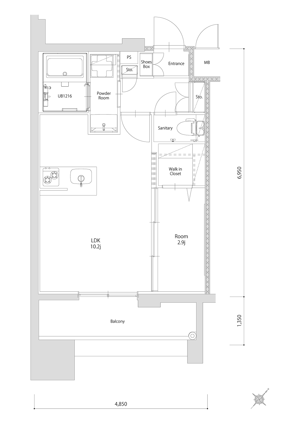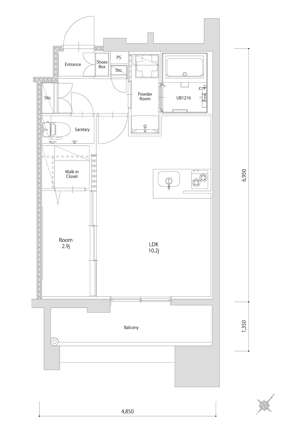 建物すべての面積は各タイプの専用面積の壁芯にて算出しておりますので、内法計算による登記簿記載面積は多少減少します。